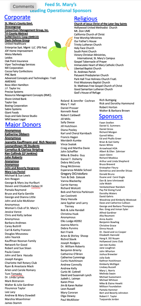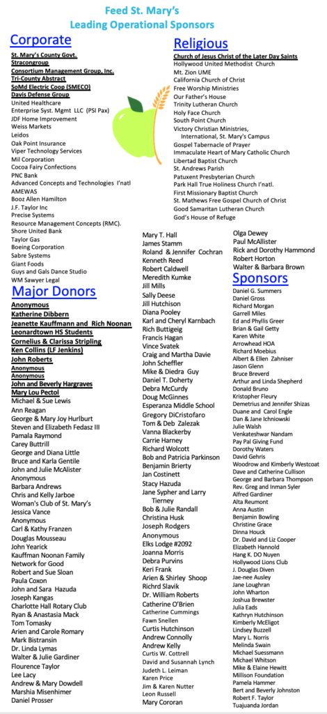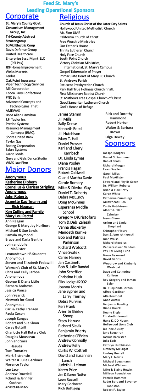 Loaves and FishesTuesdays: 10:30 – Noon First Saints/St Paul’s Church 25550 Point Lookout Road Leonardtown, MD 20650 301-475-7200